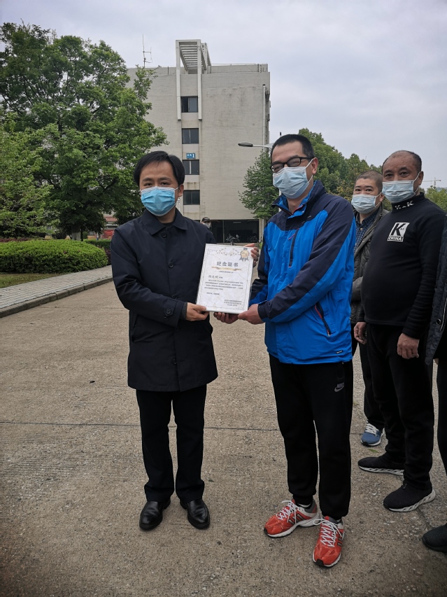 熊俊向學校贈送錦旗。江岸區向學校捐贈了價值37萬余元的物資,董仕節向江岸區頒發捐贈證書。熊俊與溫興生共同為醫護人員頒發紀念證書。