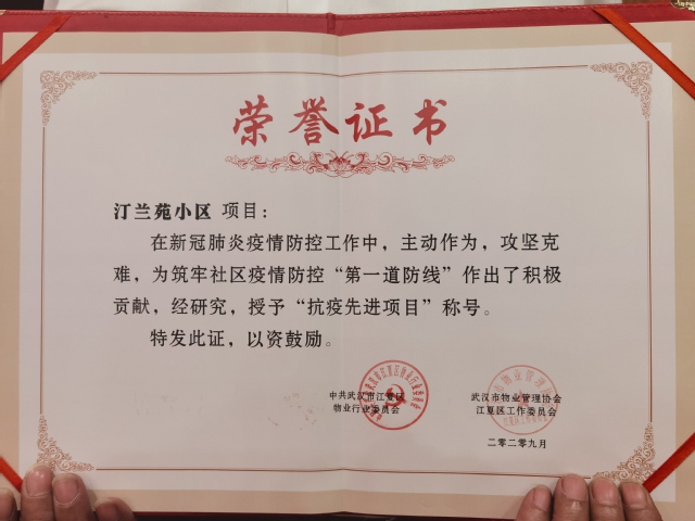 本網訊(通訊員 高瑋) 9月25日下午,武漢市物業管理協會江夏區工作委員會2019年度總結暨2020年度抗疫先進表彰大會在宜昌隆重舉行。大會表彰了武漢市物業管理協會江夏區工作委員會抗擊新冠肺炎疫情先進企業、先進項目、先進黨員、先進個人。公司再獲抗疫先進企業稱號,汀蘭苑獲評抗疫先進項目稱號,王水斌、高利霞、黃健超獲評抗疫先進黨員,王定詠、吳鳴獲評抗疫先進個人稱號。