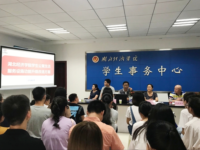 會上,億優公司總經理來靖德介紹了《湖北經濟學院學生公寓功能升級改造方案》和學生公寓功能升級平面設計圖及裝修效果圖,并對《學生公寓生活服務項目價格公示》進行說明。來自湖北經濟學院、法商學院的43名學生代表紛紛就學生公寓洗衣機、洗鞋機、晾衣架、開水、熱水、直飲水等相關問題進行了現場咨詢,對學生公寓生活服務設施配置、生活功能間裝修效果圖等方面提出了許多針對性和建設性的意見和建議。